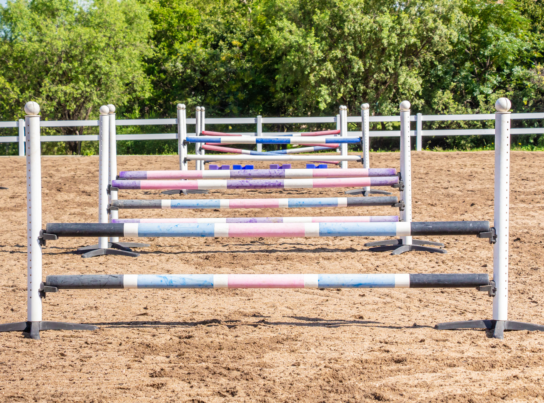 A series of poles and jumps placed in a straight line. For correct, confident jumping techniques. Improves rhythm, straightness and quickens the hind leg action. Horses learn to focus without being rushed.